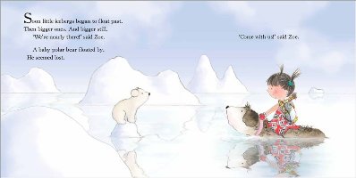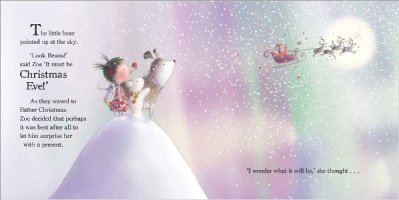 Zoe and Beans- Zoe’s Christmas List,Zoe決定要出發到北極,把聖誕節期望收到的禮物清單貼在哪兒,這樣就可以確認耶誕老人絕對可以找到這張清單,出發前她簡單帶著幾樣物品,當然還有她的狗狗Beans;因為北極非常遙遠,他們盡可能的搭飛機、搭車、搭船,一旦沒有任何交通工具可以送他們到目的地時,Zoe 只好爬到Beans背上,讓Beans游泳帶著Zoe到北極,路上他們看到一隻迷路小北極熊站在冰上,Zoe 讓小熊一起爬到Beans背上作伴到北極;到了北極,真是太刺激了,冰好滑,風冷得刺骨,禮物清單被風吹走了,還好,他們看見了美麗的北極光,也和耶誕老人打過招呼,Zoe覺得自己會得到什麼耶誕禮物就交給耶誕老公公來決定吧!於是Zoe 滿心期待著耶誕老人為她準備的surprise!
