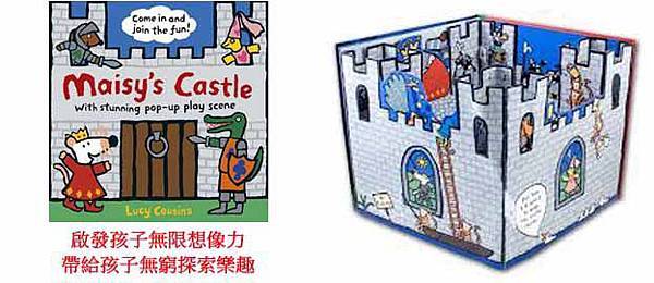 翻開書本,Charley爵士正要進城呢!通往城堡的吊橋(drawbridge)緩緩降下,在城堡裡,有哪些趣味好玩的活動呢? 有射箭,還有中世紀騎士-馬上比武大賽(tournament),真是太精采了!覺得還不過癮嗎? 現在就拿起Maisy和他的好朋友們紙偶娃娃,一起走進3D城堡裡,孩子可以親手拉下通往城堡的吊橋,還可以根據書本的箭頭指示,拉出城堡裡所有的立體區塊,透過維妙維肖的3D城堡,孩子可以仔細觀察,城堡裡的每一樓層,每一窗口,都有不同的物件和人物喔!